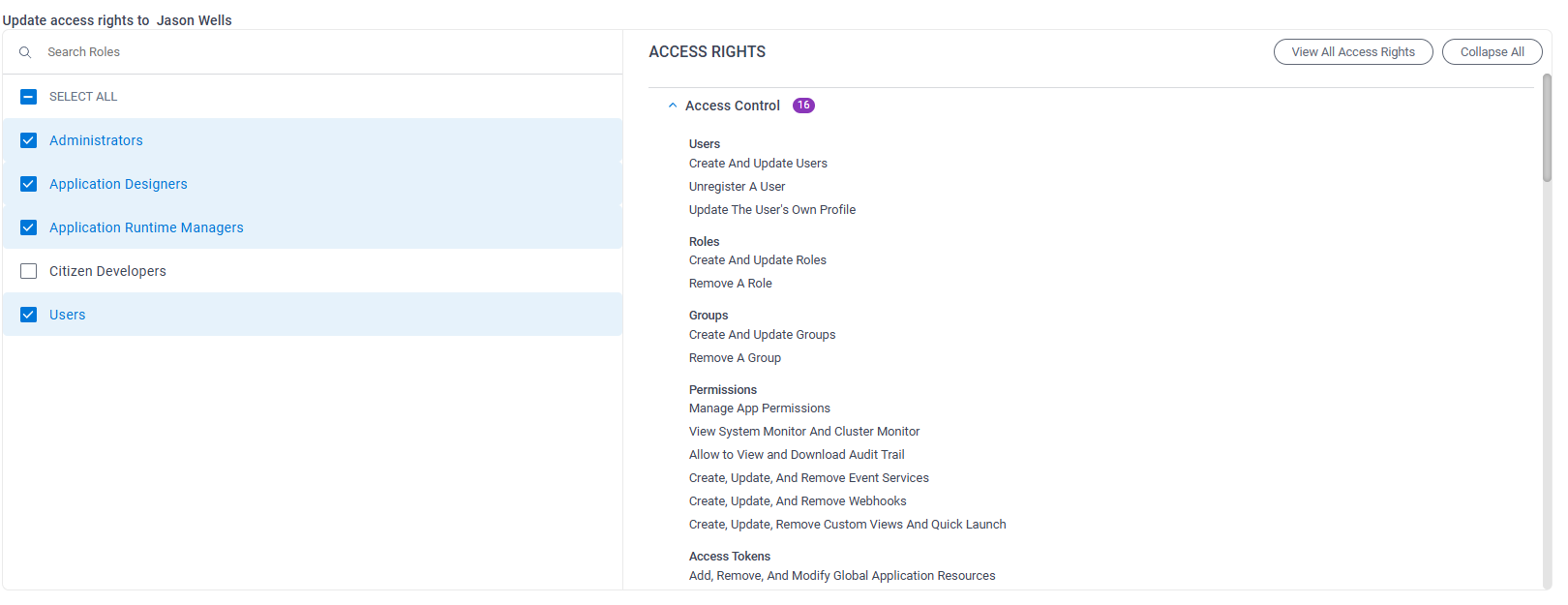 As that user is added, you can edit their access rights or permissions by enabling certain roles. There are some predefined roles, but you can create custom roles to enable or disable certain permissions or features for users. See image below for enabling roles for a user.
