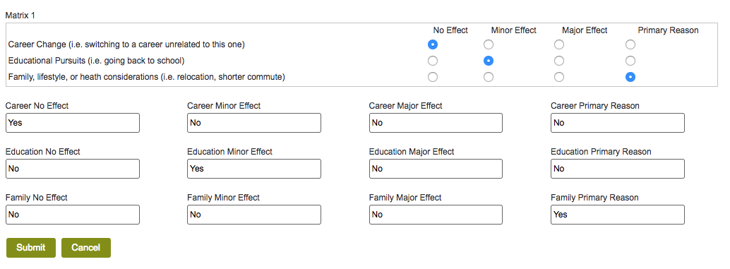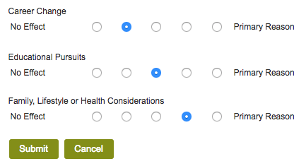 In this example, Career Change would have a value of 2, Educational Pursuits would have a value of 3, and Family, Lifestyle or Health Considerations would have a value of 4.