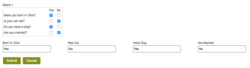 已回答The AgilePoint Matrix control offers a very nice looking, condensed, and easy to set up way to get people to respond to questions. The only problem is that the way the data is held in the Matrix requires some JavaScript to parse. Once it is parsed, it is in text boxes that can be easily handled.
