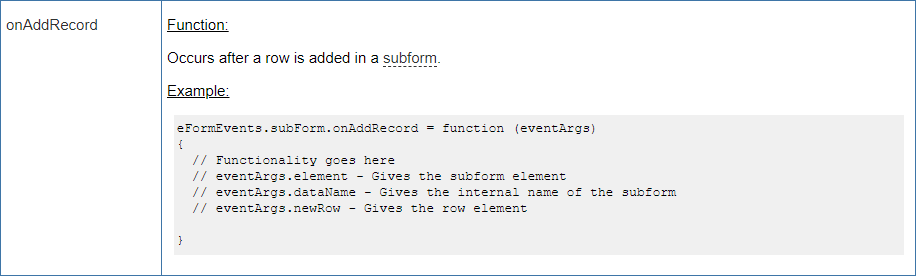 I am trying to make use of the eForm event "subForm.onAddRecord" in my form's JavaScript. Here is the AgilePoint documentation on this:
