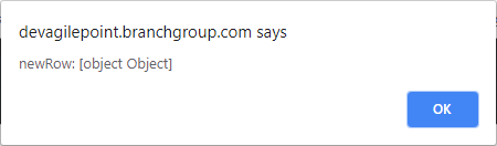 In JavaScript, this means that each of the properties eventArgs.element and eventArgs.newRow are further nested objects that have more properties within them. I recommend avoiding the alert() function when debugging because it doesn't allow you to step through the code and find what you need very efficiently; instead, start off with a debugger statement and use your browser's inspector (usually F12 or Ctrl+Shift+i) to step through the code and access nested object properties: