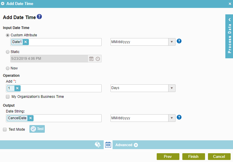 The Output field "CancelDate" is a process field I defined.