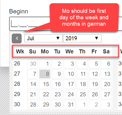 I had a requirement to change the language/localization of the date fields. AgilePoint date fields are in English and the week starts on Sunday. But we need it in German and Monday as first day of the week: