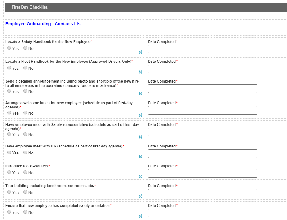Here is an example of a Checklist task that we create for the Hiring Manager to do on the employees' first day of work. We don't have rules where they have to explain why they did not do an item but we do capture the date the task was marked as completed using a rule. If they answer "Yes" to the question, we populate the Date Completed with Current Date but allow the user to change the date if necessary. If they answer "No" to the question, we clear out the date.
