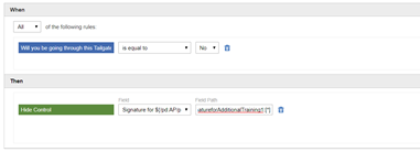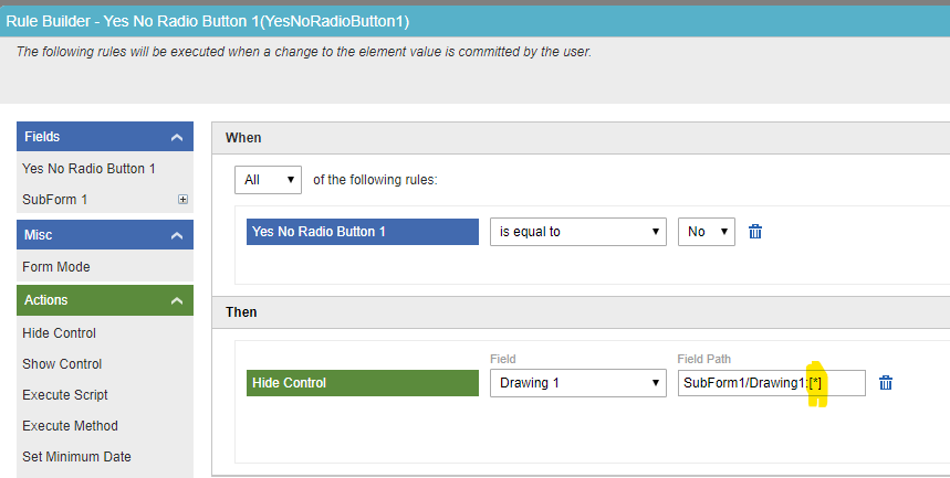 In the "Rule Builder" screen of the Yes No Radio Button, in the "Then" section, for the "Field Path" of the Drawing control, instead of SubForm1/Drawing1:[this] use SubForm1/Drawing1:[*]. Replace "this" with "*". Refer the below screen.