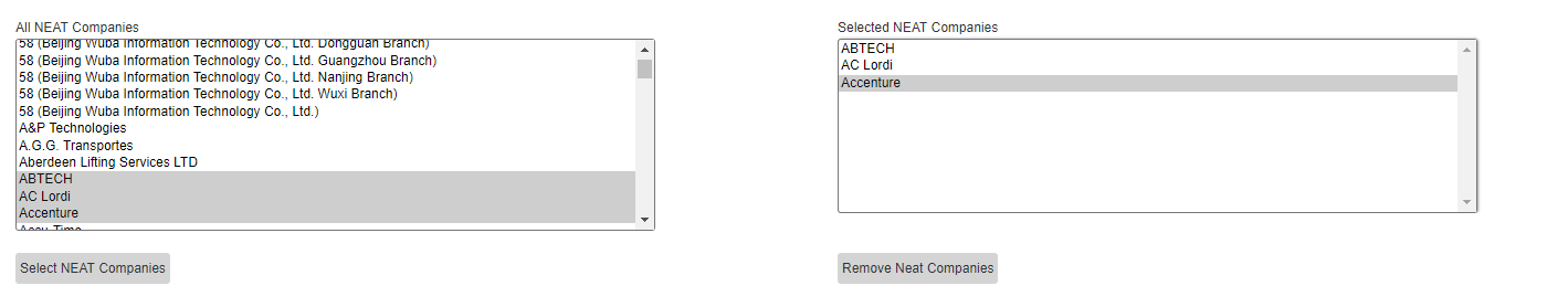 I then select and call my own javascript function on button click which calls helper method bindDataToCollectionControls to move the selected items to the right multi-select. If one is selected in error I just want to select, hit "Remove NEAT Companies" button to call a similar function>helper method and remove it.