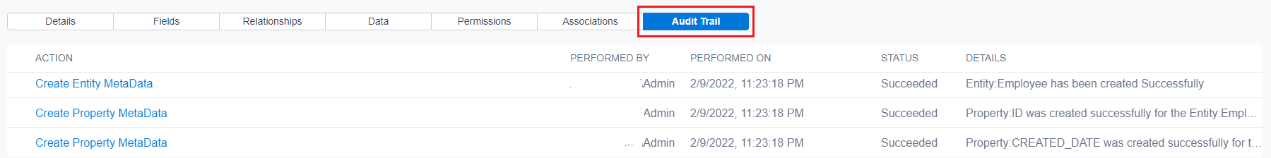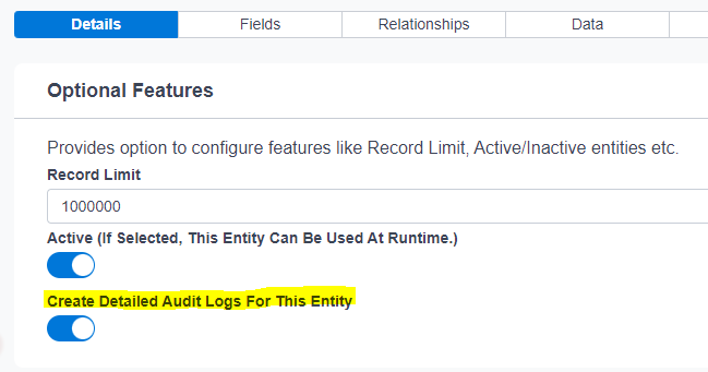 On a data entity, 'Audit Trail' can be used to track user activity on the entity. For this, audit logging has to be enabled on the entity. This option is available under 'Optional Features' section of the 'Entity Details' tab for existing entities. This can be enabled at the time of creating an entity as well. Please refer to screenshot below: